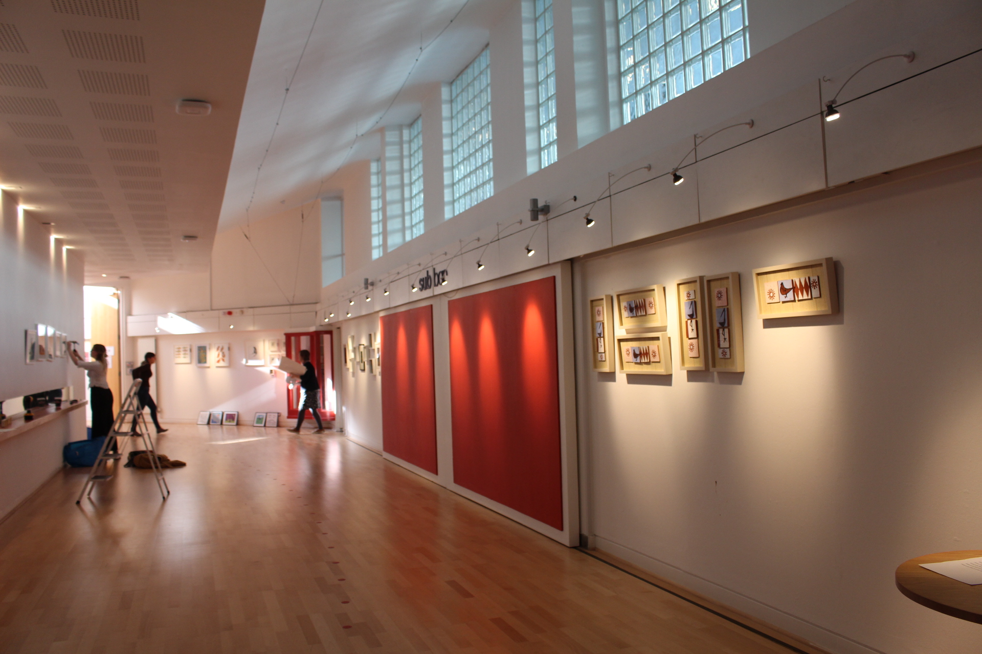 Just installed a framed tile series in Macrobert Arts Centre, University of Stirling, for their xmas exhibition. They were made in Hong Kong, carried in my hand luggage from Beijing and framed in Glasgow, then finally transported by train to Stirling – what a journey!