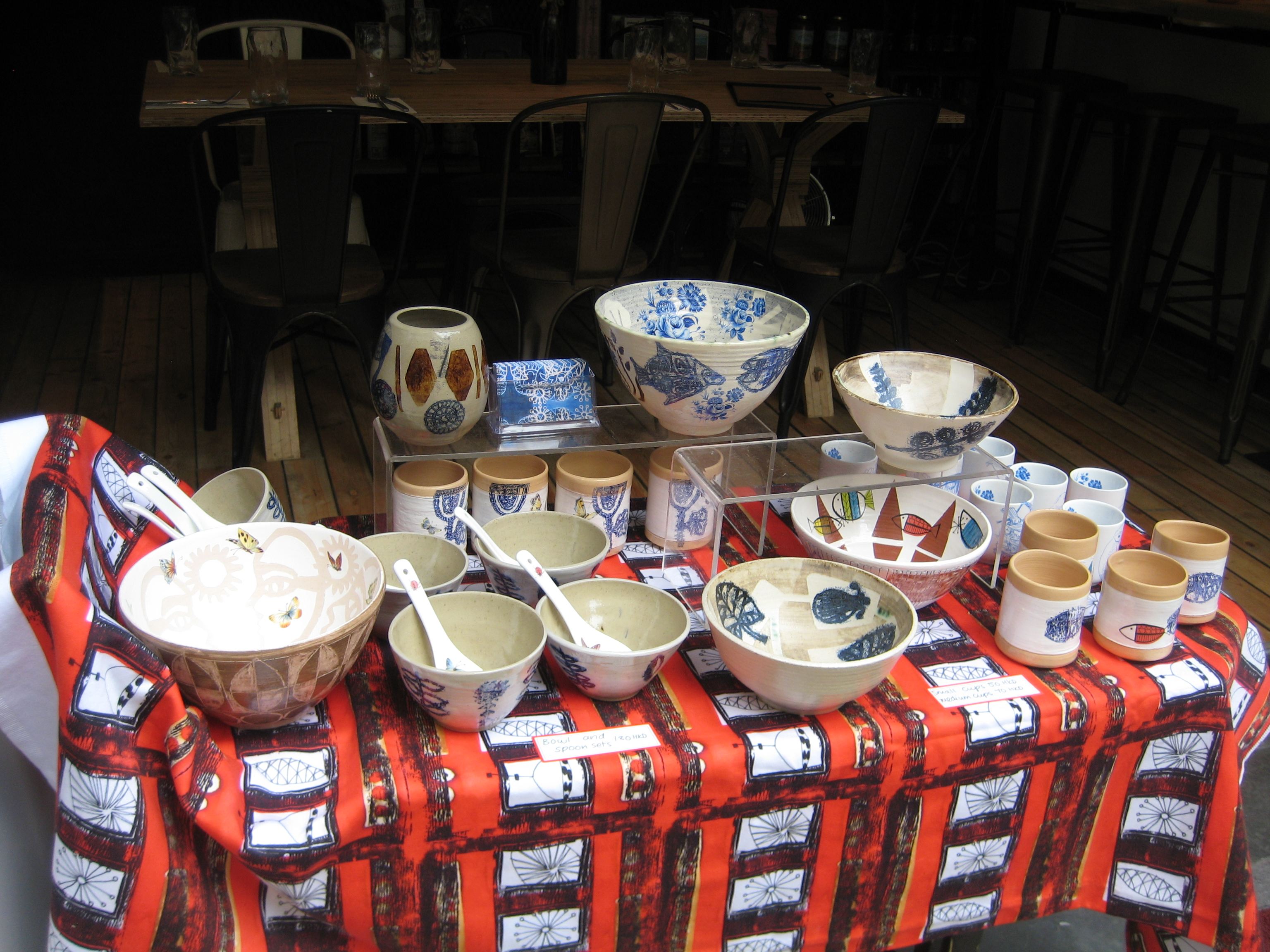 Two sales last weekend that resulted in the usual combination of meeting new and interesting people interspersed with occasional moments of boredom and tired arms, legs and back. The second event featured a great number of dogs, perhaps dog bowls would be useful. The dripping pipe above the entrance added another dimension to the display but the lunch was yummy – oolong tea soba noodles with wild mushroom and pickled radish in black sesame sauce…mmmmm